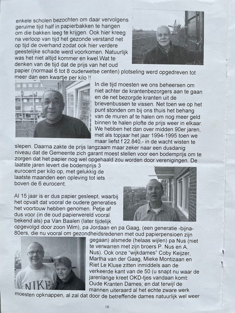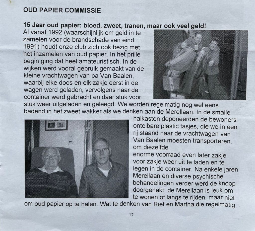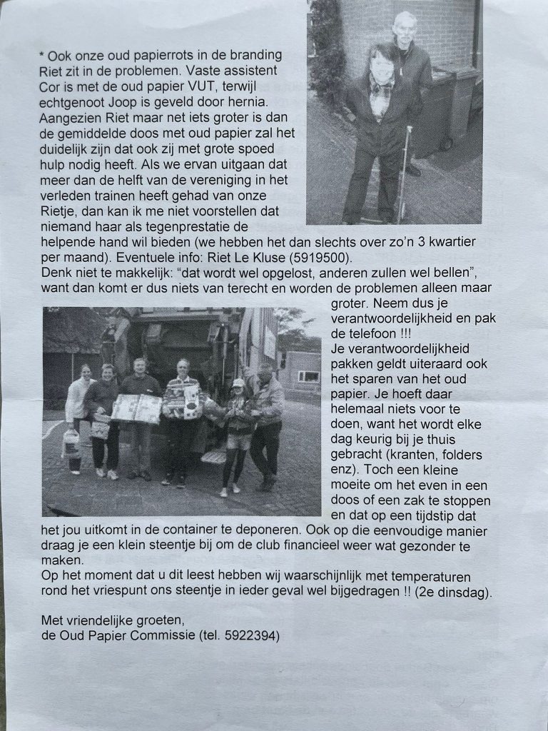 Deze week is er een abrupt einde gekomen aan de inzamelingsactie oud papier, waarmee een periode van maar liefst 33 jaar is afgesloten. Onderstaande foto’s zijn van een papieren Punt Uit uit 2007 waar vele bekende gezichten te herkennen zijn. Een leuke manier om stil te staan bij deze commissie die vanaf 1992 tot 2025 actief is geweest!