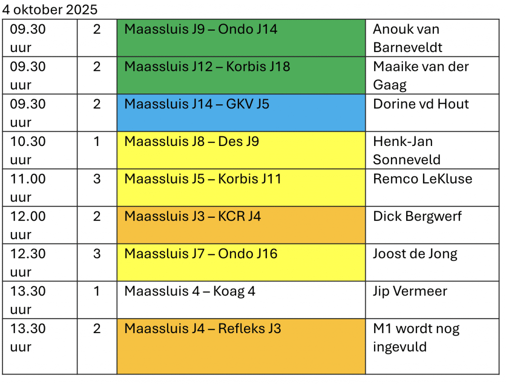 In onderstaand schema kunt u de indeling van de scheidsrechters voor de breedtesportwedstrijden van zaterdag 4 oktober zien.