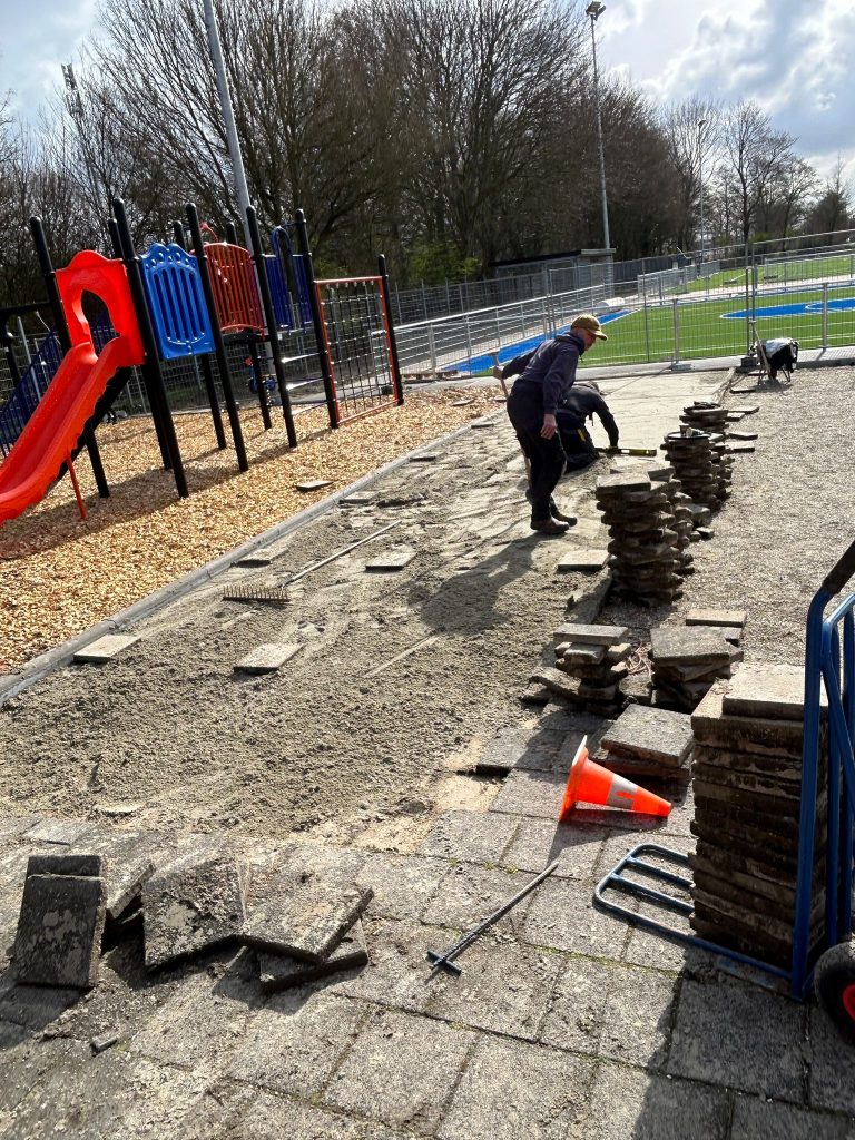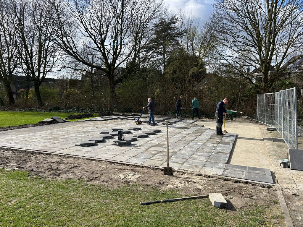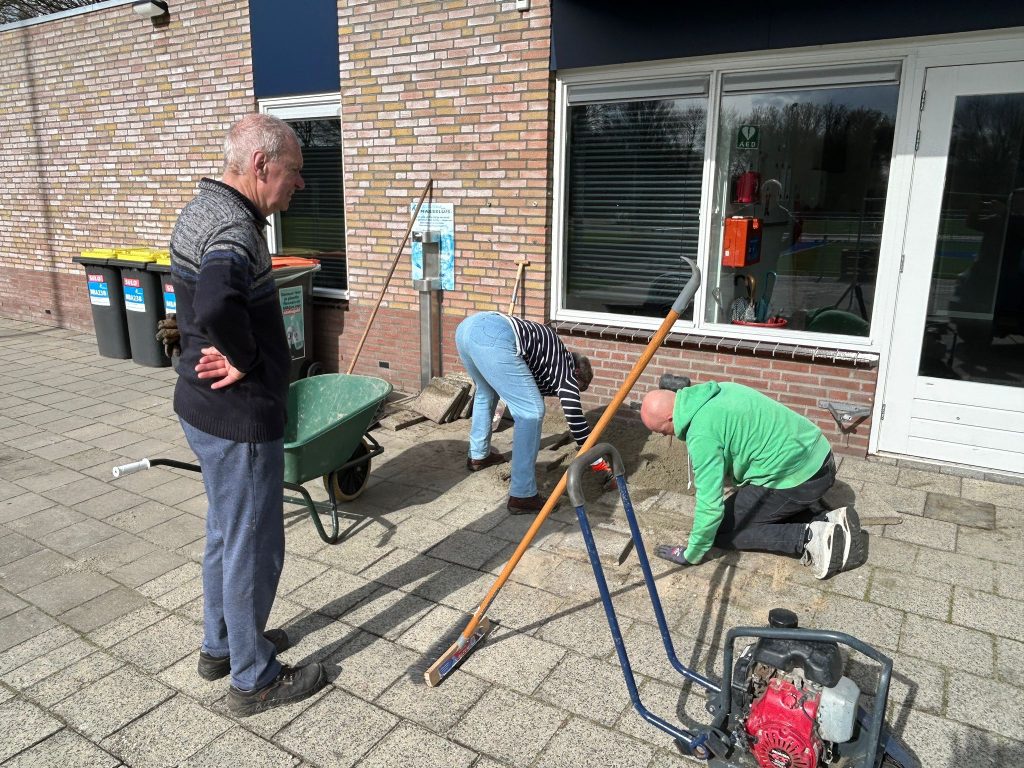 Afgelopen week is ook weer hard gewerkt door de onderhoudsploeg om het straatwerk af te krijgen. Komende week worden de laatste werkzaamheden gedaan door de aannemer en kunnen wij aan de slag met o.a. de reclameborden en het monteren van de scoreborden. Het materiaalhok staat inmiddels op de goede plaats, maar er wordt nog gekeken naar de plek van de deur. Dat is momenteel nog niet ideaal.
